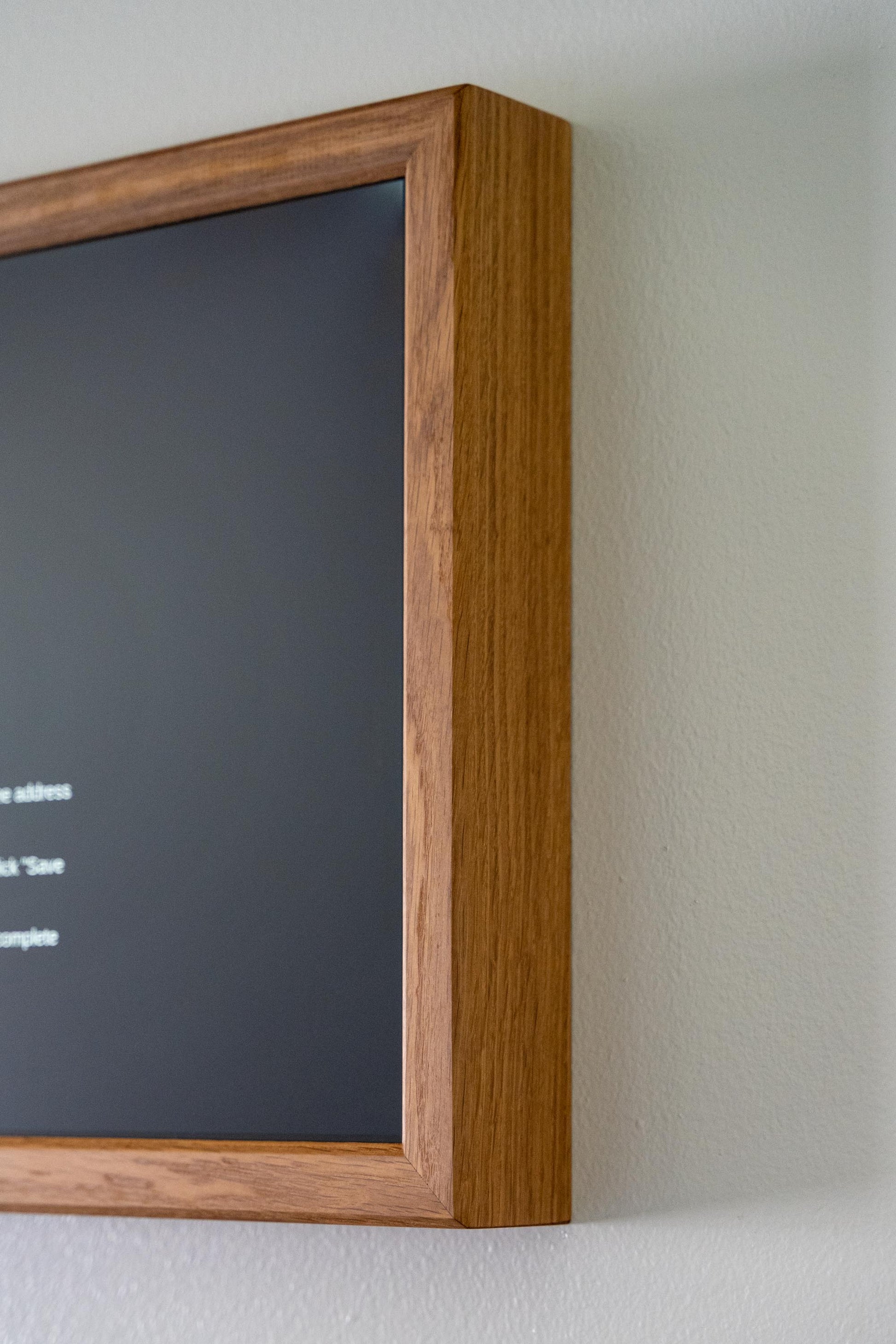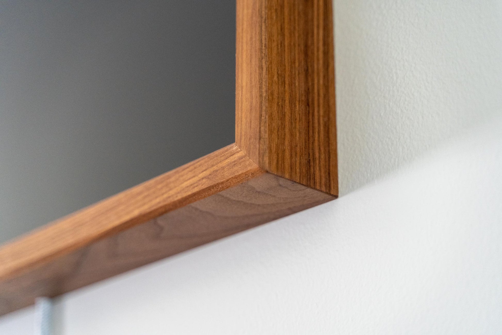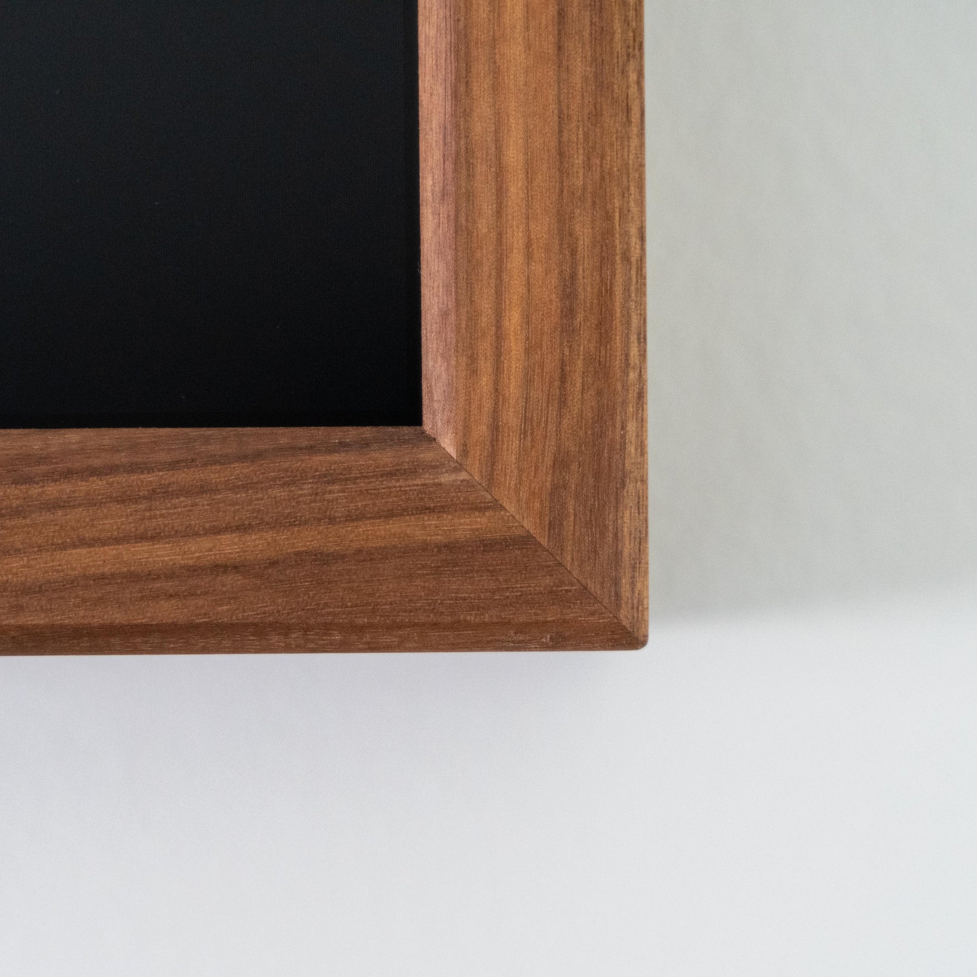 Constructed from solid walnut, oak, or maple with mitered corners and chamfered edges for a modern touch. Outside dimensions (including frame): 23” x 14” x 2.25”. Matte finish with a food safe oil/wax blend finish. -